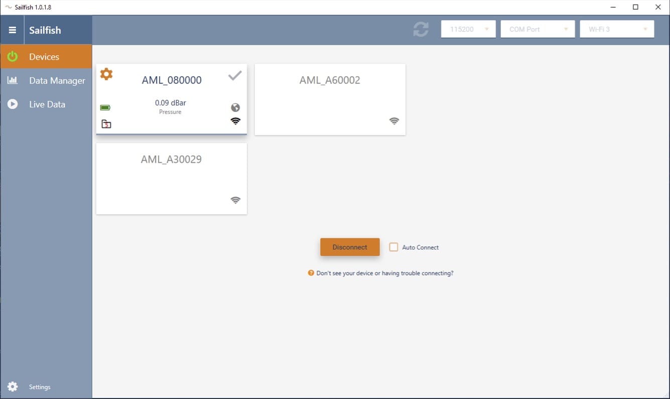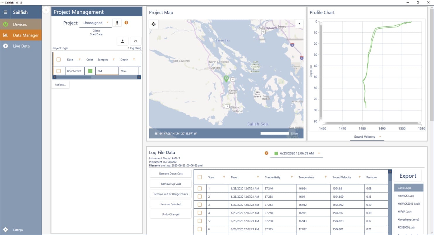 Sailfish software provides an intuitive interface for AML’s Orange Line instrumentation, offering easy instrument setup, data collection and management, and exporting tools.