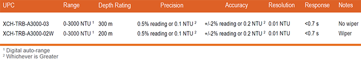 Eliminating the need for multiple sensors to accommodate large variation in turbidity, Tu•Xchange™ automatically adjusts to the appropriate range while in operation. As a result, high accuracy is achieved over the entire 0-3000 NTU range. For long-term deployments in sediment rich areas, a wiper option is now available. Tu•Xchange™ has proven to perform well long term when protected from marine growth by UV biofouling control.