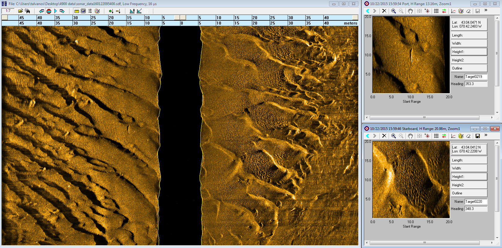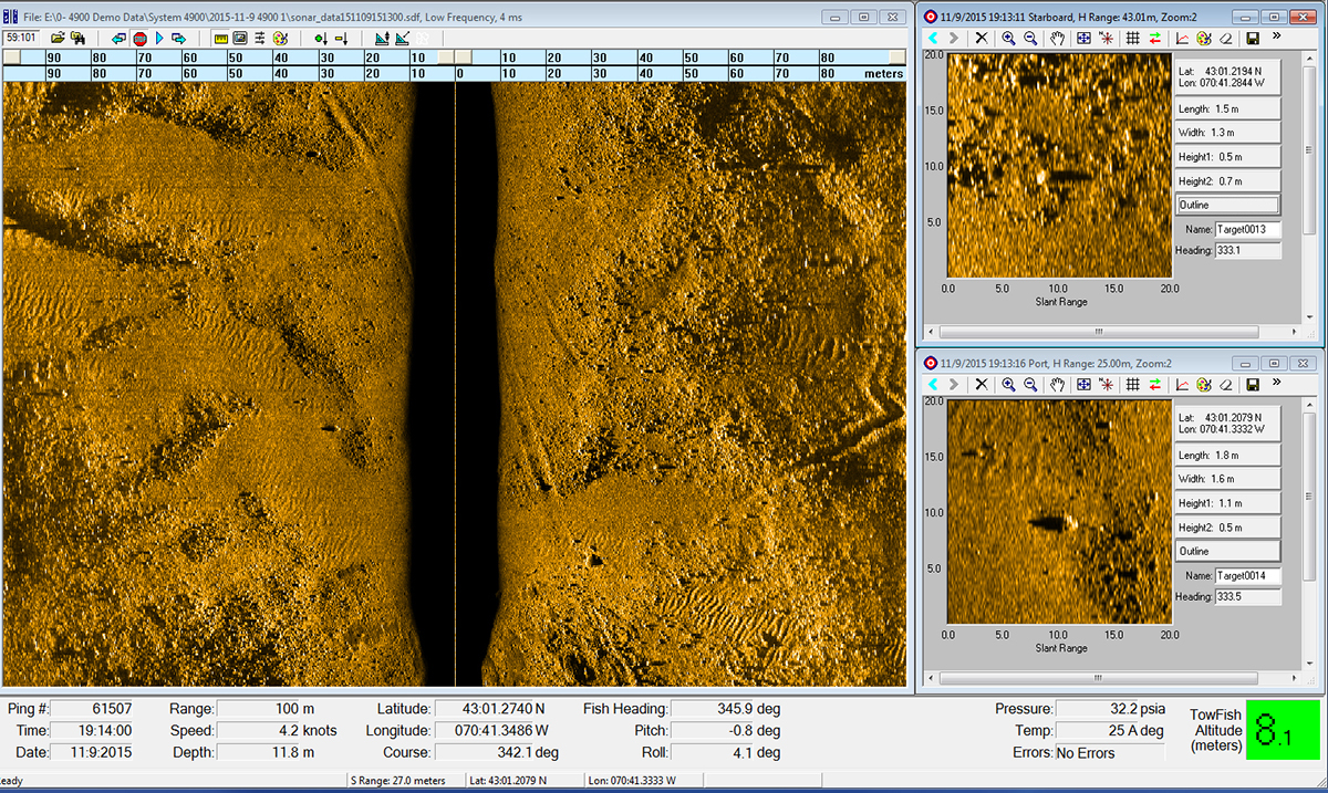 Image quality is further improved by the System 4900 transducer design which is optimized to provide very narrow horizontal beam widths and thereby exceptional along-track resolution. The combined result of these discriminating features is a high quality image resolution at long ranges which is comparable to higher frequency systems. When sonar detail and range is important, look to Klein for the solution!