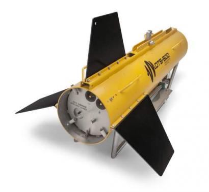 The DTS Towfish is a solid-state instrument with a 500 Joule per second charge rate which allows a typical repetition rate of 150 Joule at 3Hz. Utilizing the integrated high resolution depth sensor, the system compensates for the vertical movement of the Towfish. Its orientation is monitored using the internal AHRS sensor. The DTS-500 has a number of electrical and mechanical interlock systems designed to provide operational safety together with system safety.